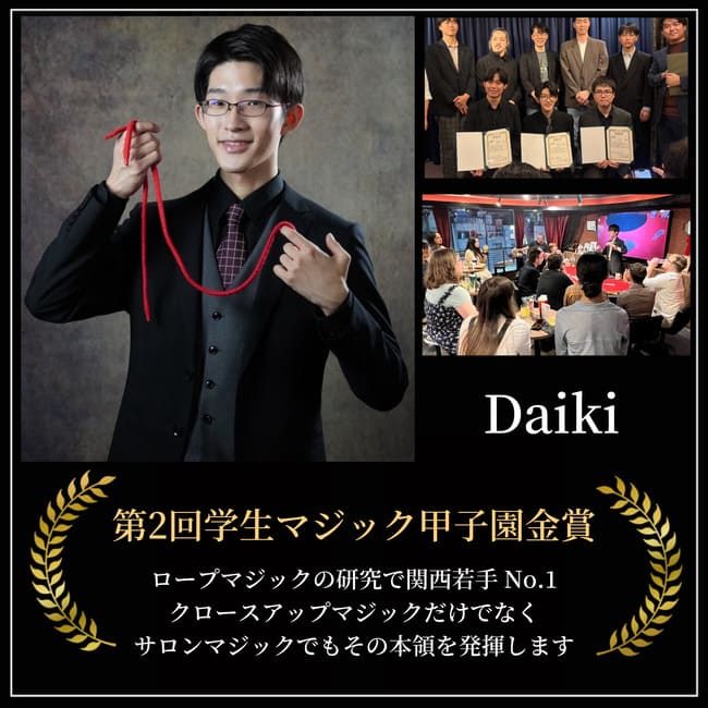 20歳のころ有名マジシャンと大学の先輩の手品演技を見てマジックに興味を持つ。 ユニバーサルスタジオジャパンのエンターテイメントオペレーション本部の社員としてハリーポッターエリアの立ち上げプロジェクトにも参加。USJでエンターテイメントの極意を学びながら、マジシャンとして二足の草鞋でマジックショーの依頼を受けてはマジックショーに従事する。 その後「マジックで人と人の縁を繋ぎたい」を自身の使命とし、プロマジシャンとして独立。 マジックをみて楽しい不思議と思っていただくのはもちろんの事、マジシャンとゲスト(大切なお客様)の心の通わせたマジックを超える感動をお届けし、またマジックでゲストの皆様の絆をさらに深めるお手伝いをさせていただきたいと思っております。 自動車メーカーHONDA、世界最大手家具店IKEA、など各種大手企業ともマジシャン契約を結び、出張によるステージマジックから当店でのクロースアップマジックなど、365日マジックをすることがない日がないくらいの多忙なマジック人生を歩む。